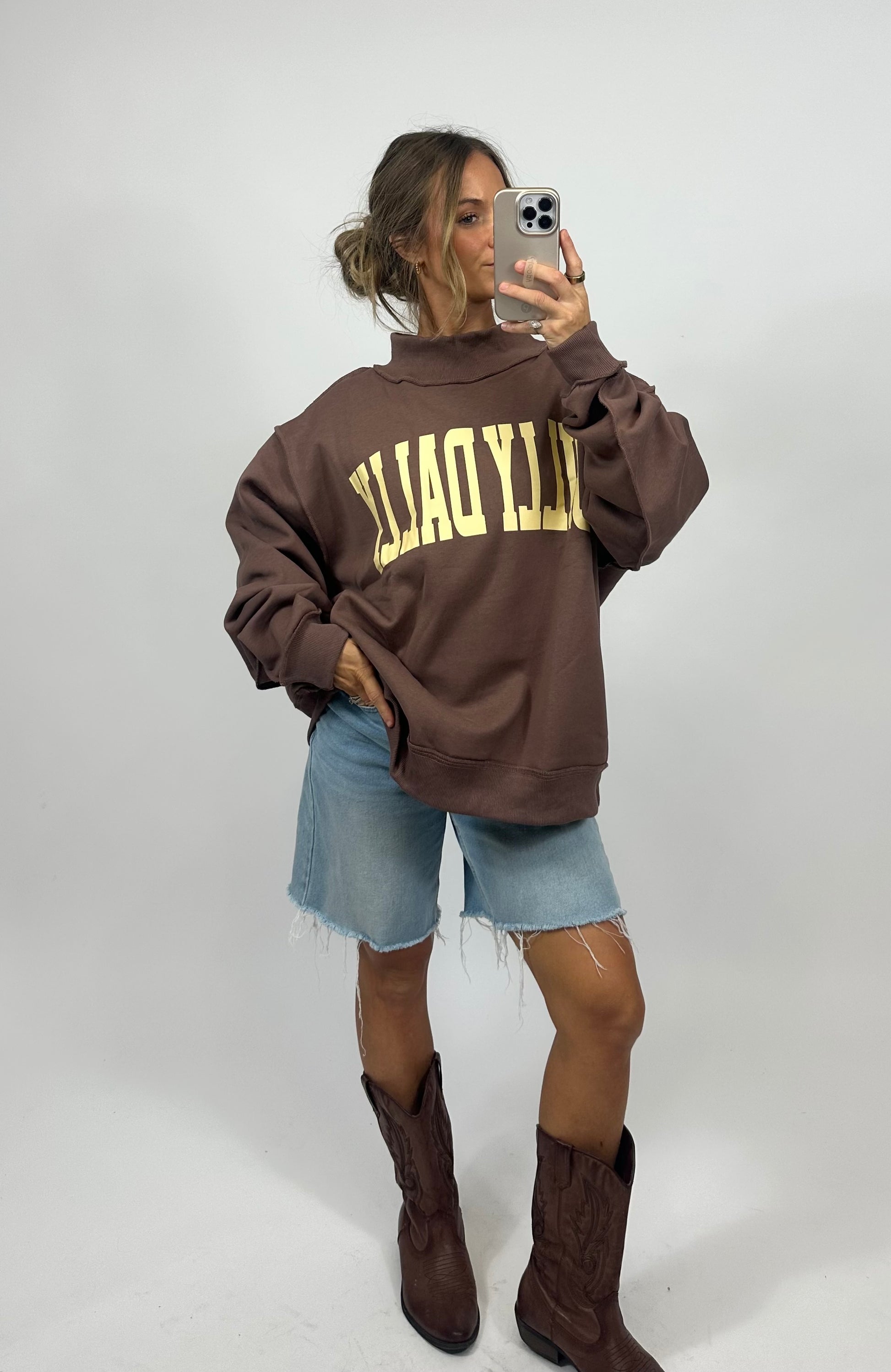 Playful and perfectly relaxed — The Dilly Dally Sweatshirt is your go-to cozy layer for slow mornings and easy weekends. Featuring a soft mock neck, relaxed fit, and vintage-inspired “Dilly Dally” graphic across the front, it adds just the right touch of personality to your everyday look. Available in two colorways — a cheerful yellow and a warm coffee brown — it’s the definition of comfy-cool.