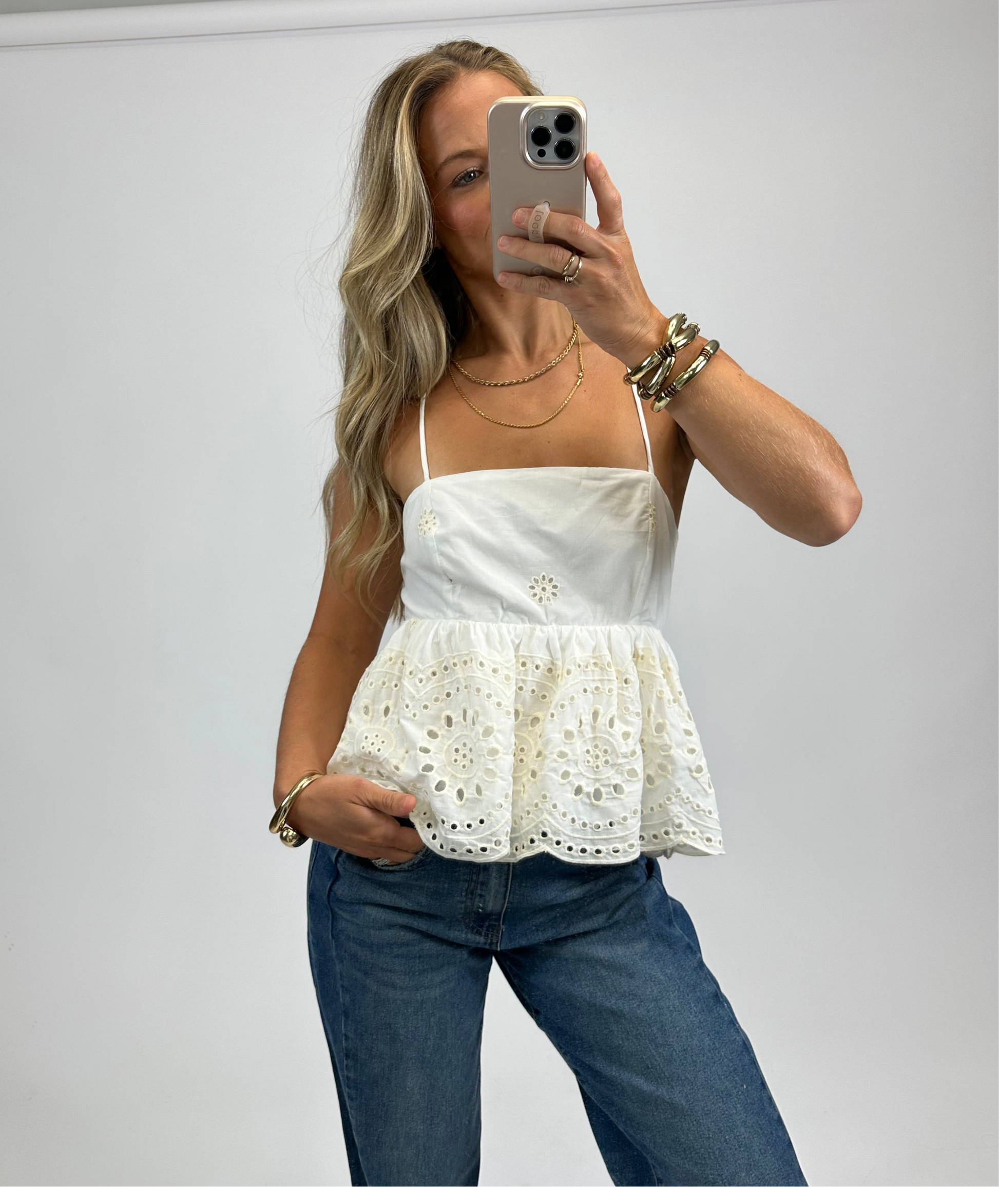 Soft, simple, and full of sunshine—the June Tank is your go-to for warm weather days. Made from breezy white eyelet fabric with delicate spaghetti straps and a slightly cropped fit, she’s sweet but not too sweet. The adjustable tie-back adds the perfect touch of detail (and the perfect fit). Pair it with high-rise denim or your go-to flowy skirt for an effortlessly pretty look.