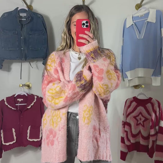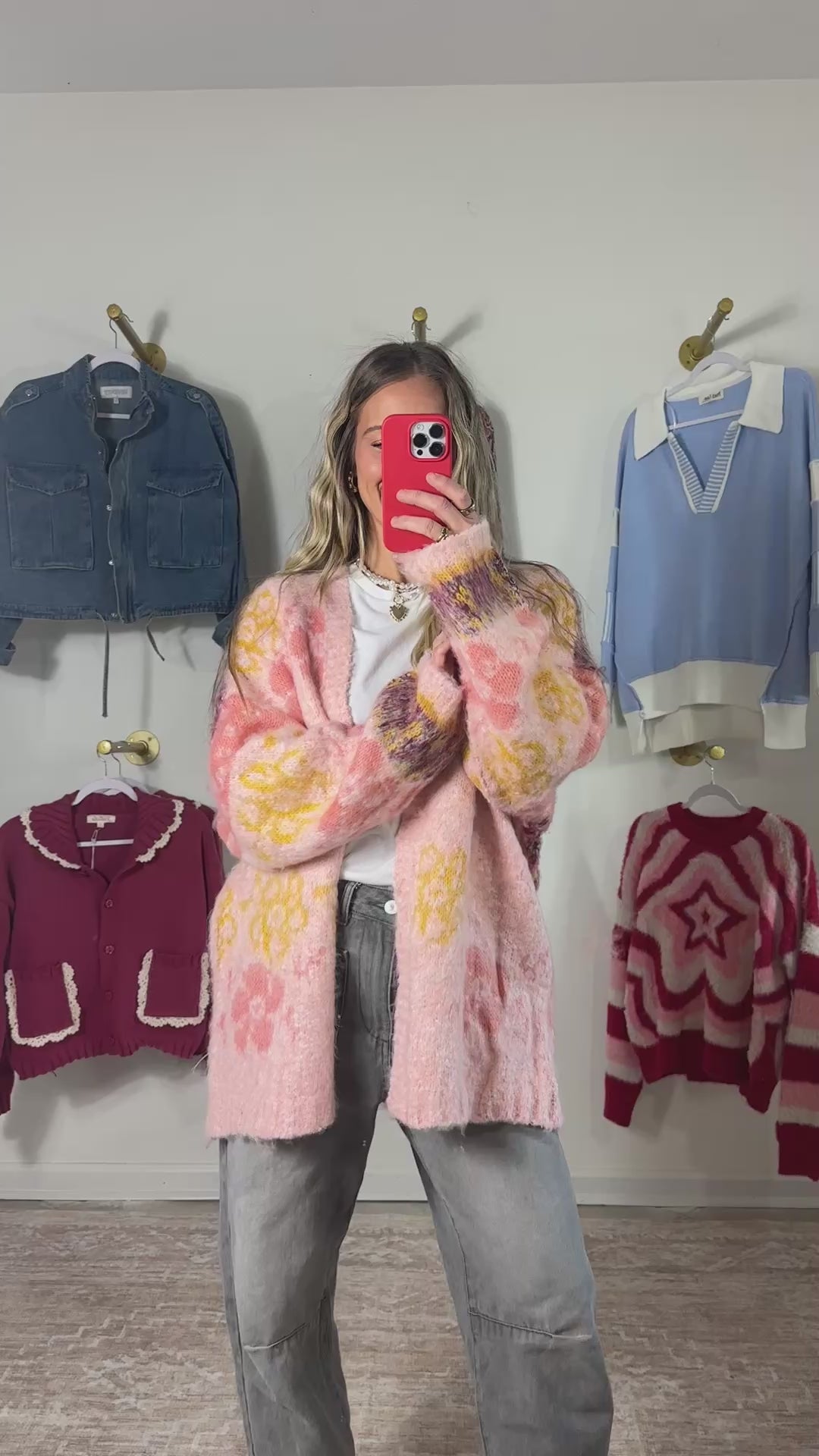 Cozy up in style with our oversized floral knit cardigan! A dreamy layering piece perfect for cooler days/nights.