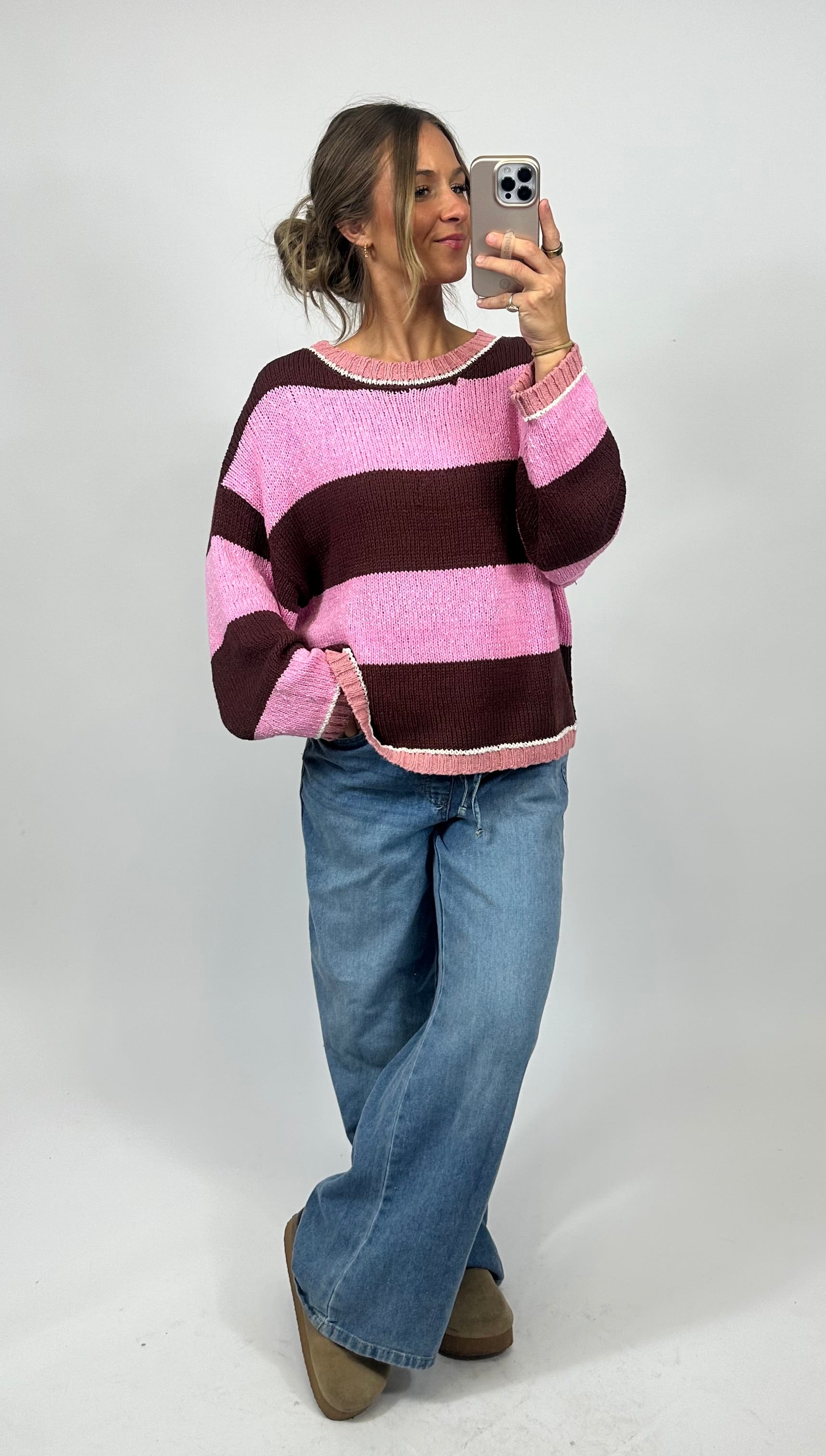 Playful yet cozy, The Poppy Sweater features a soft pink and brown stripe pattern in an easy, drop-shoulder fit. Crafted from a plush knit with just the right amount of slouch, it’s the kind of sweater you’ll live in all season — perfectly relaxed, endlessly comfortable, and effortlessly cute with denim or layered over a slip skirt.