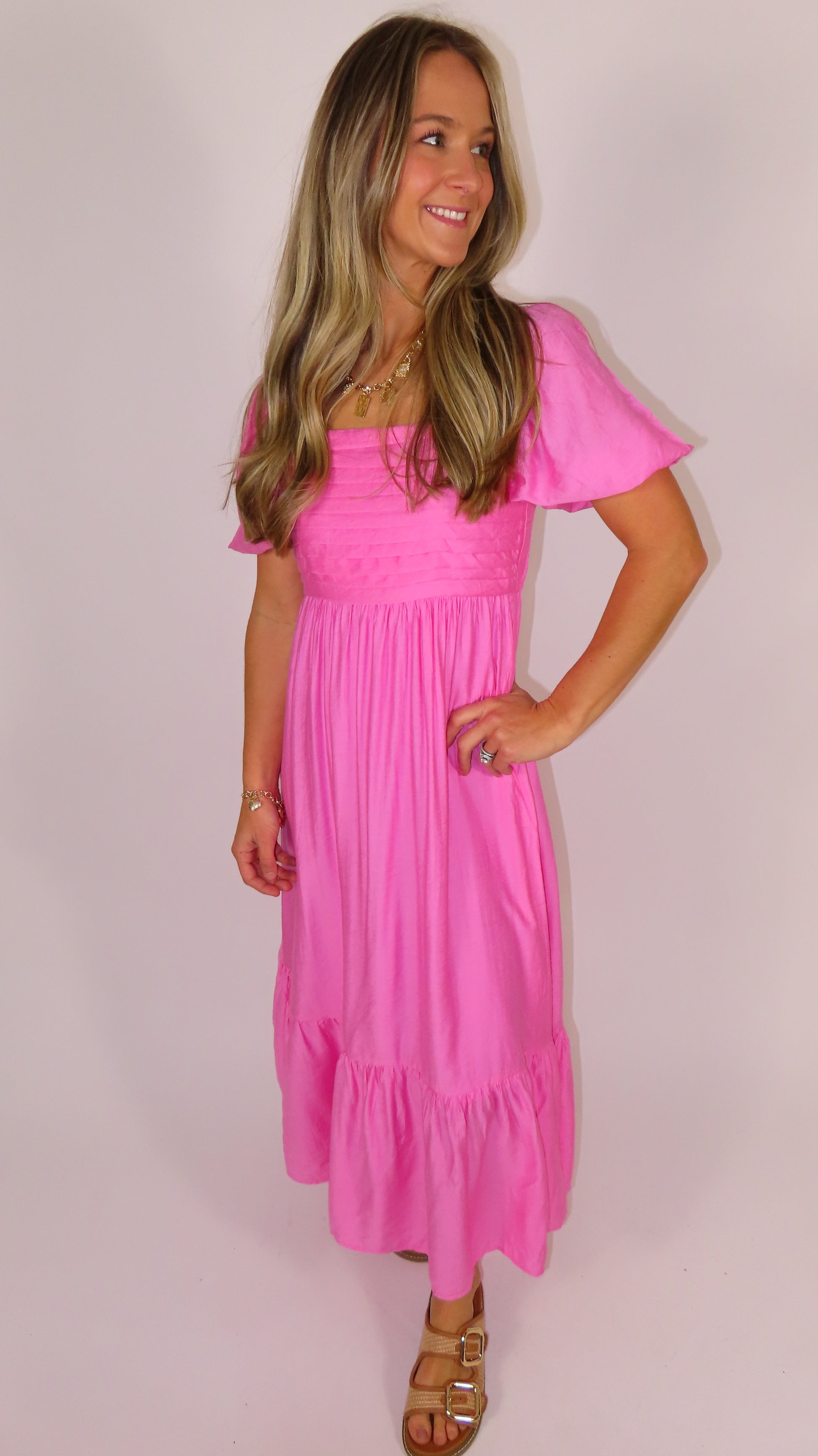 Soft, feminine, and effortlessly elegant, the Rosé Midi Dress is a dream in every detail. Featuring delicate pleated accents and romantic puff sleeves, this midi dress brings a touch of vintage charm with a modern fit. The elastic back ensures comfort and flexibility, while the flattering silhouette makes it perfect for any occasion—from garden parties to date nights. In a beautiful blush pink hue, this dress is your go-to for timeless grace and effortless sophistication.