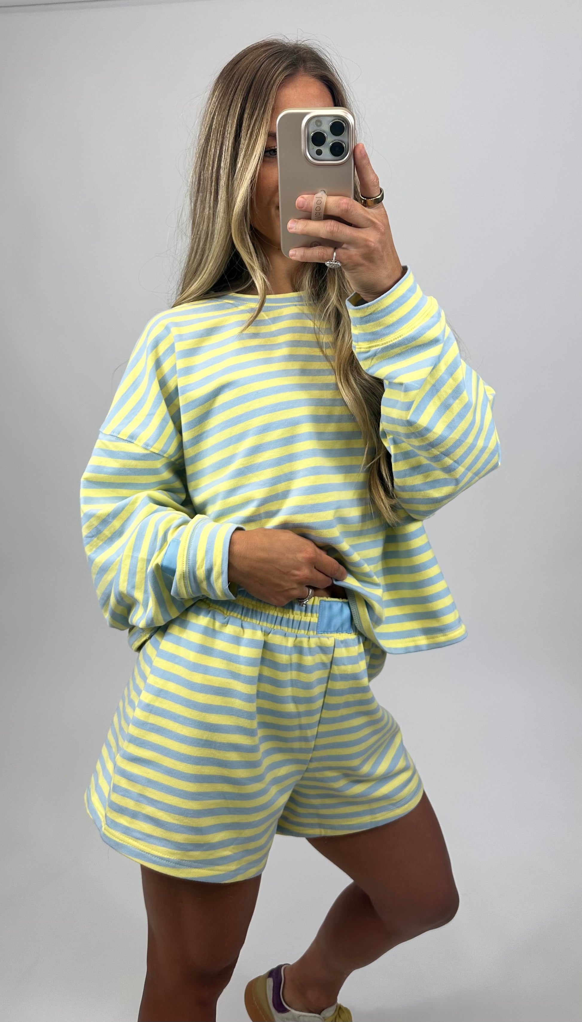 The perfect match to our Seaside Citrus Lounge Sweatshirt, these striped terry lounge shorts are made for comfort and casual style. Featuring blue and lemon stripes, they bring a fresh, playful vibe that feels just right for transitional seasons.