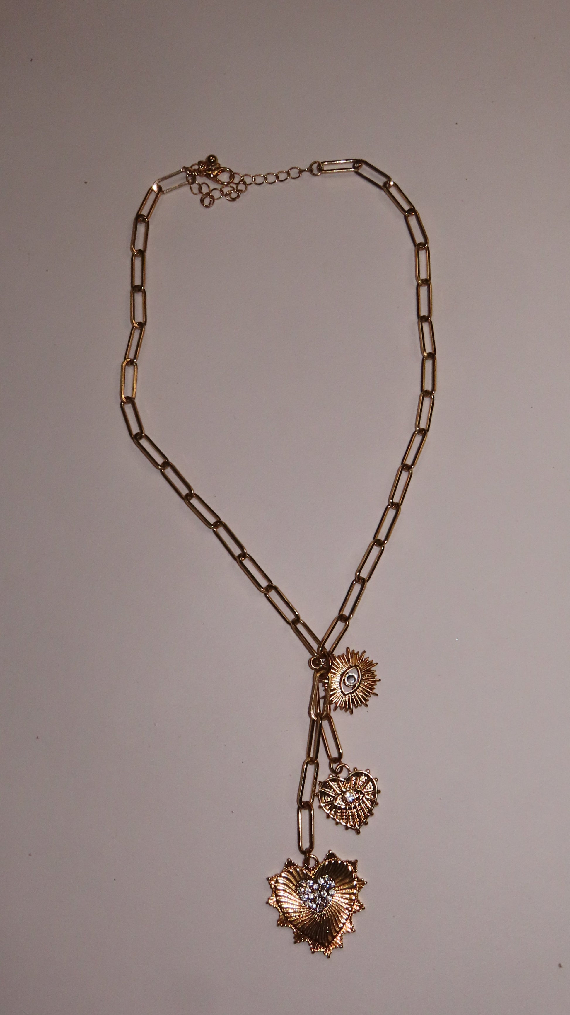 Drop chain charm necklace featuring a sun heart and evil eye symbol.