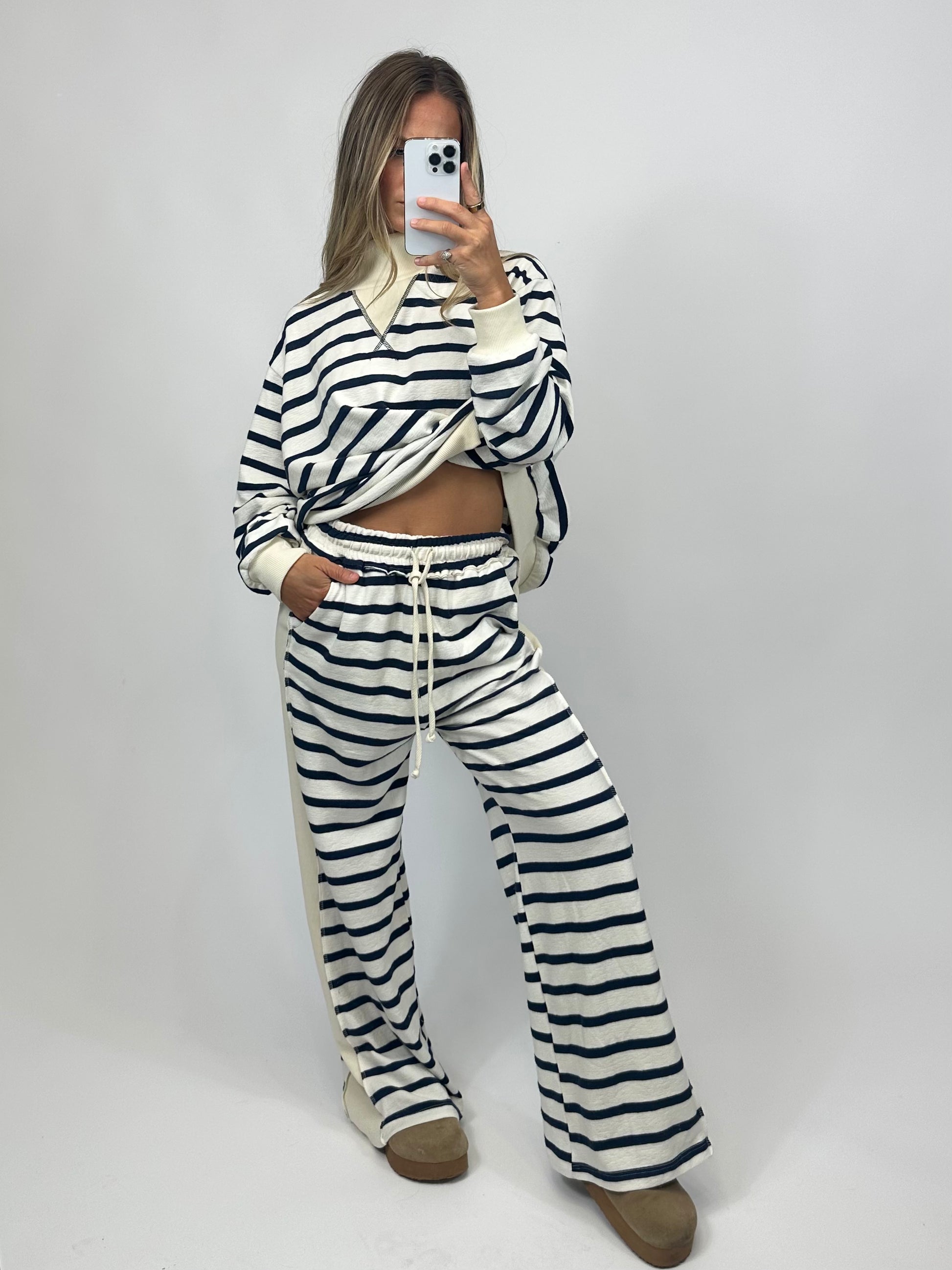 Soft, textured, and effortlessly cozy, The Mariner Sweatpant is a fall essential for lounging, layering, or casual outings. Featuring a thick elastic drawstring waistband, side pockets, and subtle ribbed-like texture, these pants combine comfort with understated style. Off-white ribbed stripes run along the sides for contrast, accented with delicate hemming for a crafted, storybook finish. Pair them with the matching Mariner Mockneck for a curated, cozy autumn look that feels both timeless and playful.